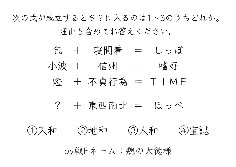 ヒント2:寝巻・信州・不貞行為・東西南北を別の言葉で言い換えると…?